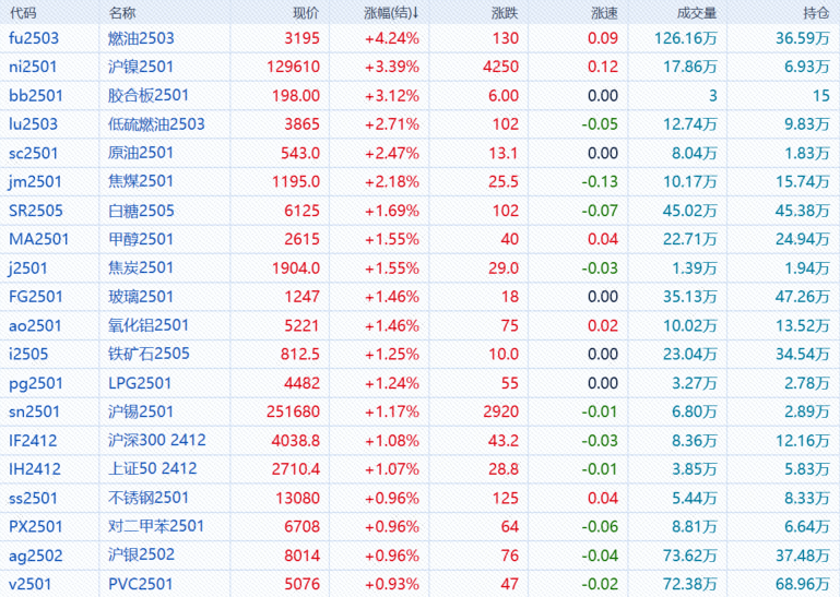 12月12日,午盘收盘,国内期货主力合约涨多跌少。燃料油涨超4%,沪镍涨超3%,低硫燃料油(LU)、SC原油、焦煤涨超2%,白糖、焦炭涨近2%;跌幅方面,沪铅、生猪跌超1%。