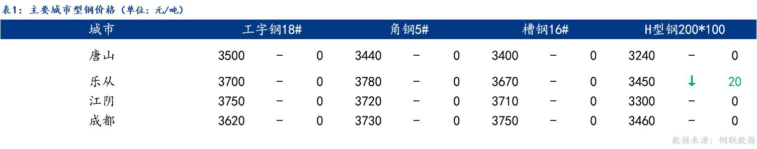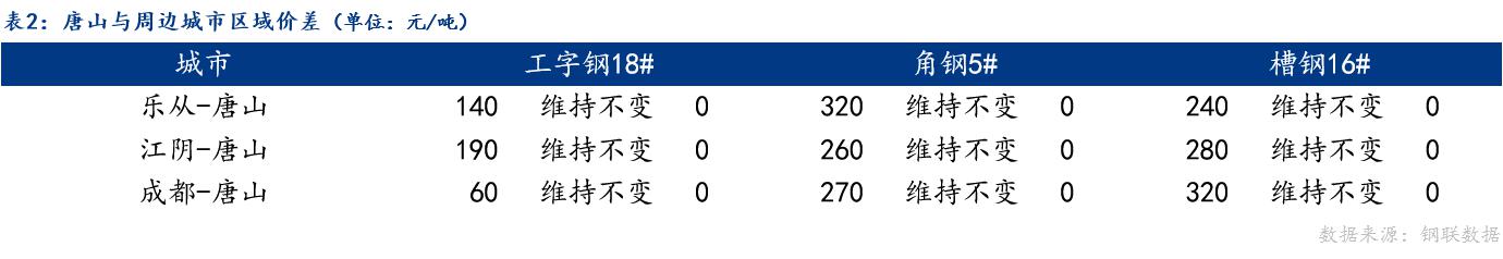从区域价差情况来看,乐从、江阴、成都市场工字钢、角钢、槽钢与唐山价差维持不变。