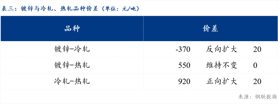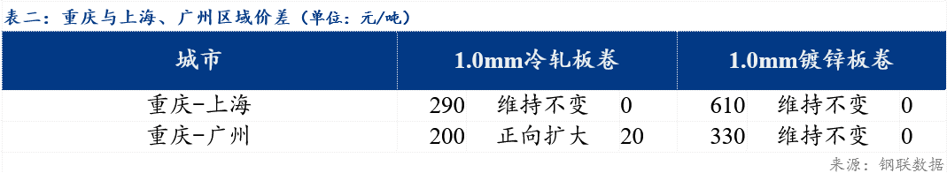 重庆、上海地区冷轧板卷区域价差维持不变;重庆、广州冷轧板卷区域价差扩大20元/吨。重庆、上海镀锌板卷区域价差维持不变;重庆、广州镀锌板卷区域价差维持不变。镀锌、冷轧品种价差反向扩大20元/吨 ;镀锌、热轧品种价差维持不变 ;冷轧、热轧品种价差扩大20元/吨 。