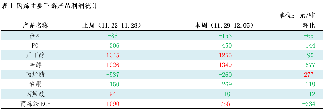丙烯衍生品成本压力增大,拖累丙烯需求。丙烯价格持续维持在偏高位,下游产品成本压力上升,尤其主力下游聚丙烯粒料与粉料价差较小,粒料成本压力增大,粉料利润状况同样欠佳,装置开工积极性下降。12月上旬东方宏业一条聚丙烯装置、淄博海益一条聚丙烯装置停工,对丙烯需求存有一定影响。化工类下游产品盈利状况同样偏弱,其中环氧丙烷亏损程度较为明显。12月上旬丙烯需求支撑相对稳定,但伴随丙烯供应趋势增加,下游工厂观望情绪加重,需求面对丙烯价格支撑力度小幅减弱。