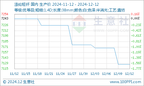 据生意社商品行情分析系统,12月以来在需求淡季之下,国内涤纶短纤市场行情呈现小幅下跌,截止12月12日江浙主流工厂1.4D*38mm均价在7126元/吨,较月初下跌0.7%。
