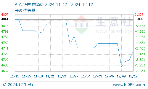 本周国内PTA现货市场行情呈现小幅上行,截止12月12日华东地区PTA市场均价在4734元/吨,较周初上涨1.14%。但自身供应仍显充足,珠海英力士110万吨PTA装置于12月初检修20余天。嘉兴石化PTA总产能370万吨/年,其中1#150万吨装置于12月12日检修,重启时间待定。供应小幅缩量,PTA行业开工在88%附近。但国内PTA供应仍维持高位,关注下周独山能源270万吨PTA新装置计划12月中旬投产进展。