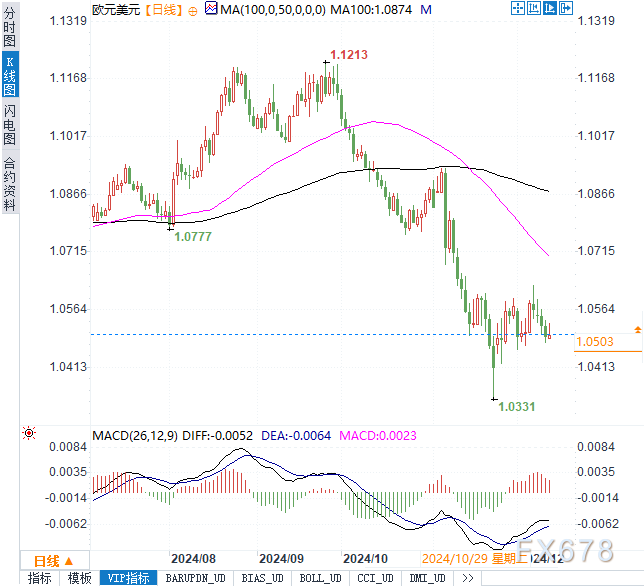 欧元兑美元上涨0.14%,交投于1.0509。市场普遍认为,欧洲央行晚间将降息25个基点,并可能提供更加鸽派的前瞻指引。知名机构分析师指出,尽管市场已计入明年欧洲央行的宽松政策,但欧元区经济基本面疲弱,长期来看欧元兑美元仍面临下行压力。