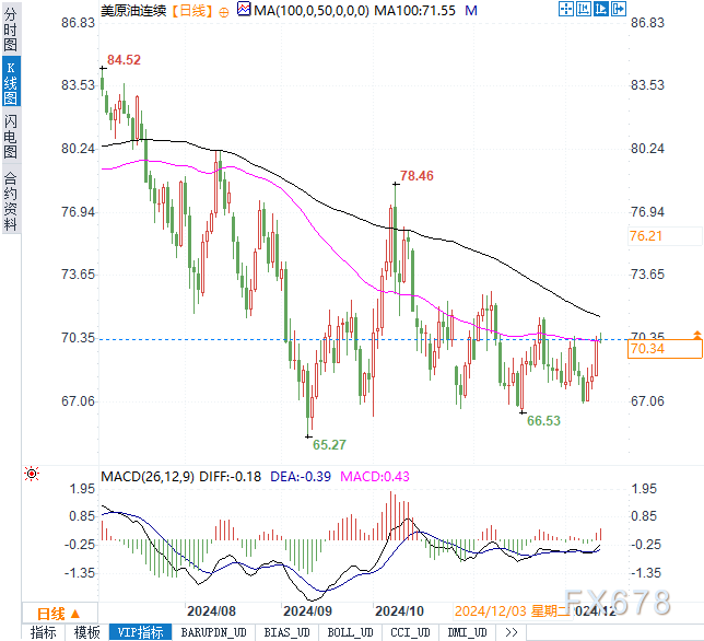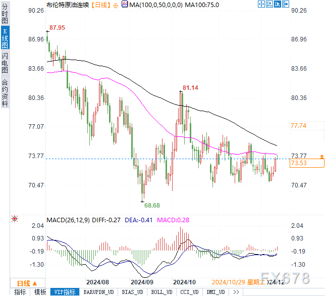 截至18:18,布伦特原油交投于73.66美元/桶,日内小幅上涨0.16%;美原油报70.47美元/桶,上涨0.26%。美元指数略微下跌0.116%,现货黄金下滑0.2%,报2712.50美元/盎司。主要货币对中,欧元兑美元上涨0.14%,英镑兑美元涨0.09%,而美元兑日元则维持在152.511附近,涨幅有限。