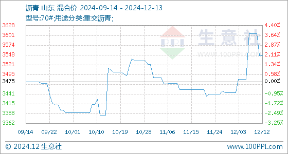 12月13日,生意社沥青基准价为3546.00元/吨,与本月初(3445.00元/吨)相比,上涨了2.93%。