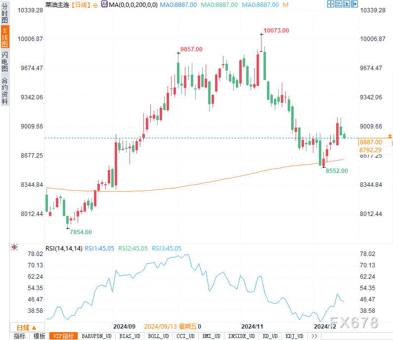 本周菜油震荡上涨后小幅回调,价格下跌1.61%。加拿大油菜籽产量预期下调至1880万吨,为油菜籽供应提供支撑。然而,国内菜籽库存较高,叠加菜油商业库存累积,短期供应充裕的背景限制了价格上涨幅度。总体来看,菜油价格走势更多取决于后续中加关系及进口政策变化,短期内可能维持震荡格局。