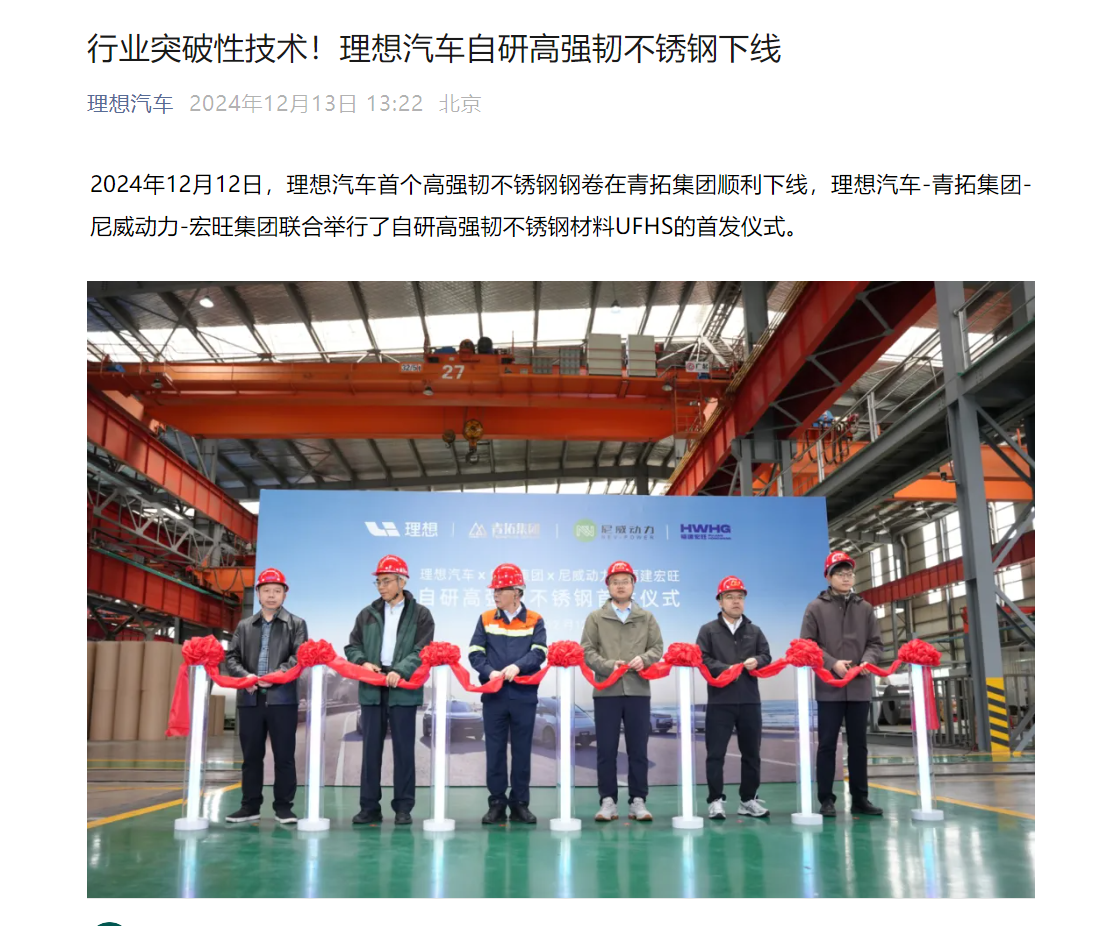 每经AI快讯,据理想汽车官方公众号消息,12月12日,理想汽车首个高强韧不锈钢钢卷在青拓集团顺利下线。该自研不锈钢强度比传统不锈钢提升46%,耐应力腐蚀性能显著提升。理想汽车L系列全系采用高压不锈钢油箱,该材料在高压油箱应用可以极大的增加油箱在极限工况下的安全性能。该材料的下线,也标志着理想汽车在高强韧不锈钢领域具备了自主配方开发和零件设计能力。