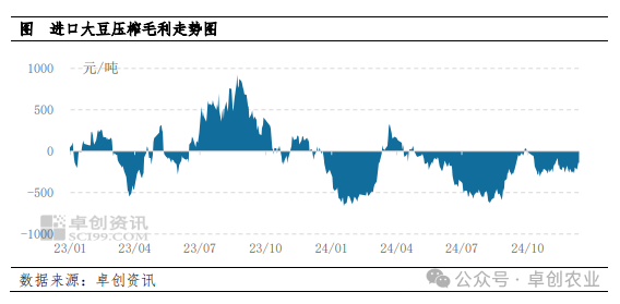 周内进口大豆压榨企业的理论毛利呈现亏损状态,平均亏损水平达176.06元/吨