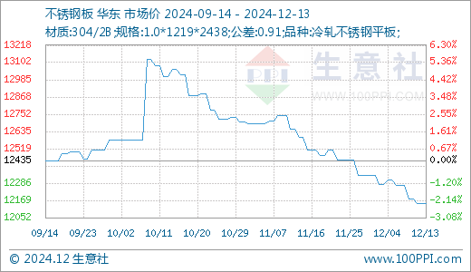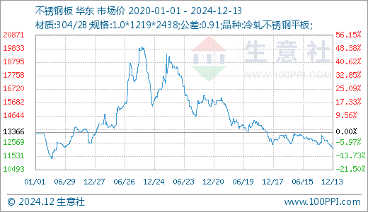 据生意社价格监测,本周不锈钢价格小幅下跌。截止12月13日,现货304/2B不锈钢平板1.0*1219*2438(公差0.91)的日均价为现报价12150元/吨,较周初下跌0.23%,同比下跌2.35%。