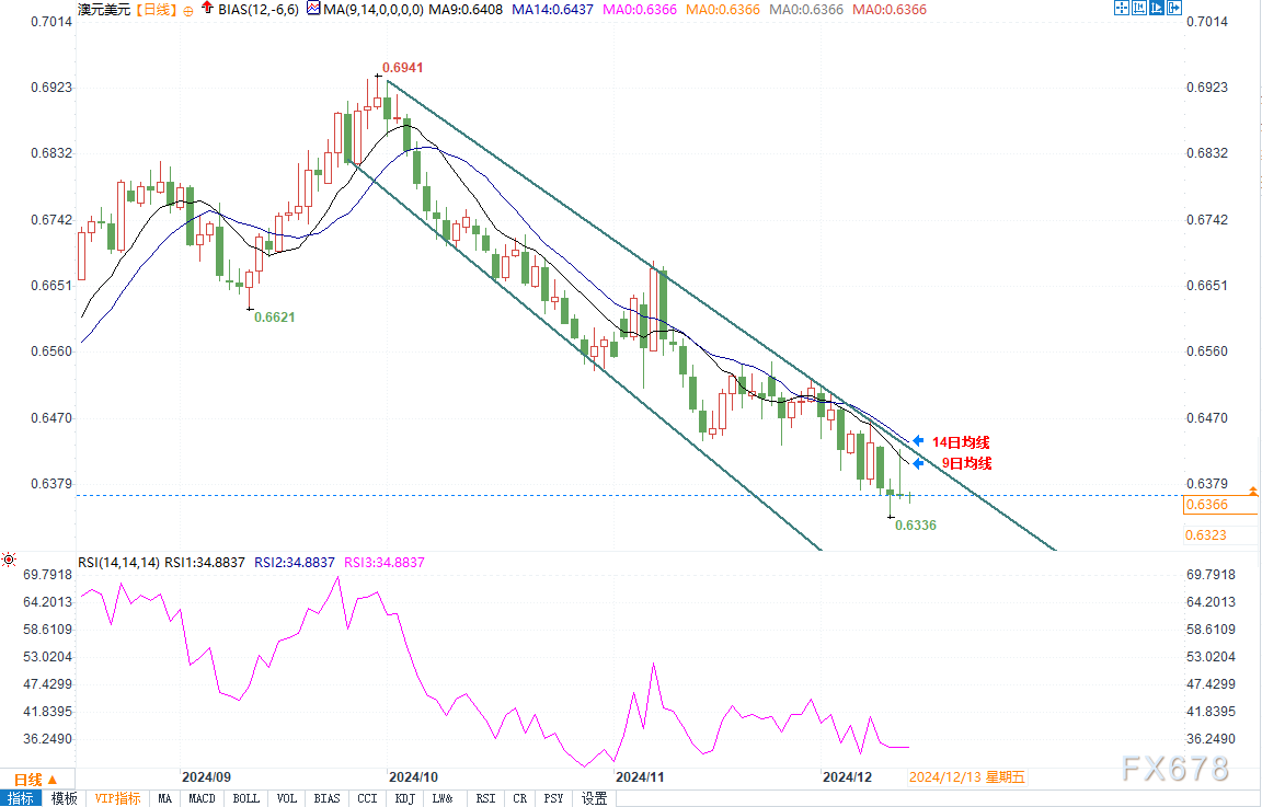 12月13日周五,澳元/美元汇率徘徊在0.6368附近。从日线图来看,汇价在下降通道内持续走低,显示出看跌偏向加强的迹象。14日RSI略高于30水平,表明看跌势头依然存在;