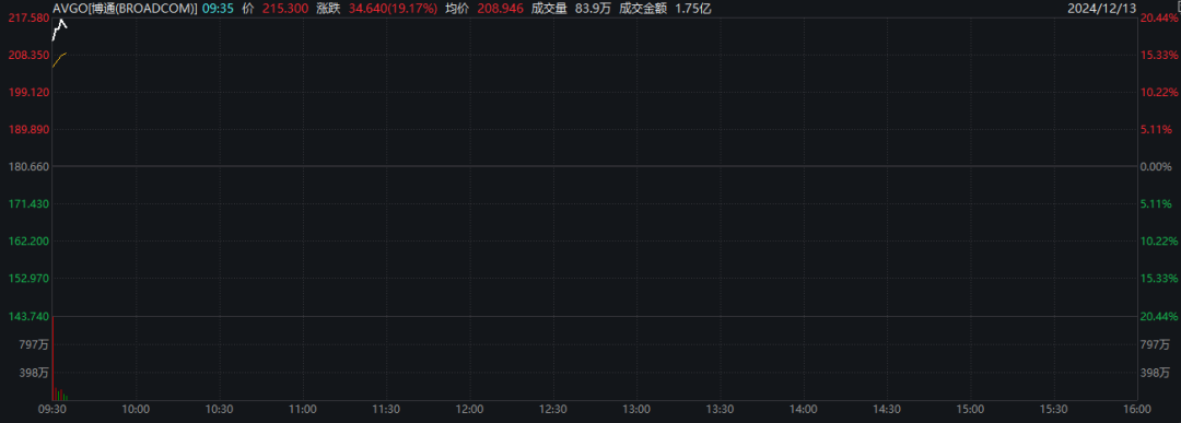 博通盘初涨一度涨超20%,总市值升至1万亿美元上方,公司第四财季利润超预期,全财年AI收入大涨220%。