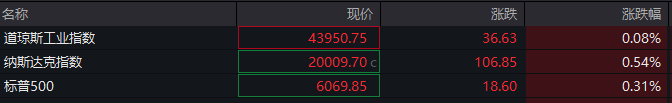 美股方面,美股三大指数均小幅高开,截至发稿,道指涨0.08%,纳指涨0.54%,标普500指数涨0.31%。