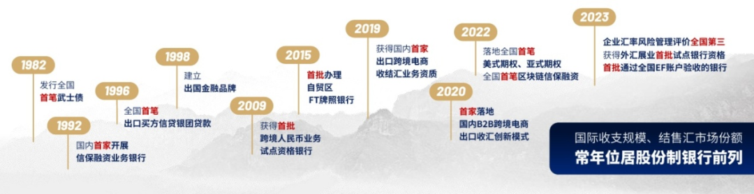 从1991年代表中信公司在日本东京第一次发行浮动利率日元债券,到1996年牵头国内13家金融机构完成首笔2.69亿美元出口买方信贷银团贷款;从1998年与美国驻华大使馆签定备忘录,在国内多个城市以当地分支机构代理美使馆收取签证申请费,并以此独家业务为契点在零售业务领域打响“出国金融”王牌,再到2009年首批获得跨境人民币业务试点资格、2015年首批办理自贸区FT牌照、2019年首家获得出口跨境电商收结汇业务资质、2020年首家落地国内B2B跨境电商出口收汇创新模式。