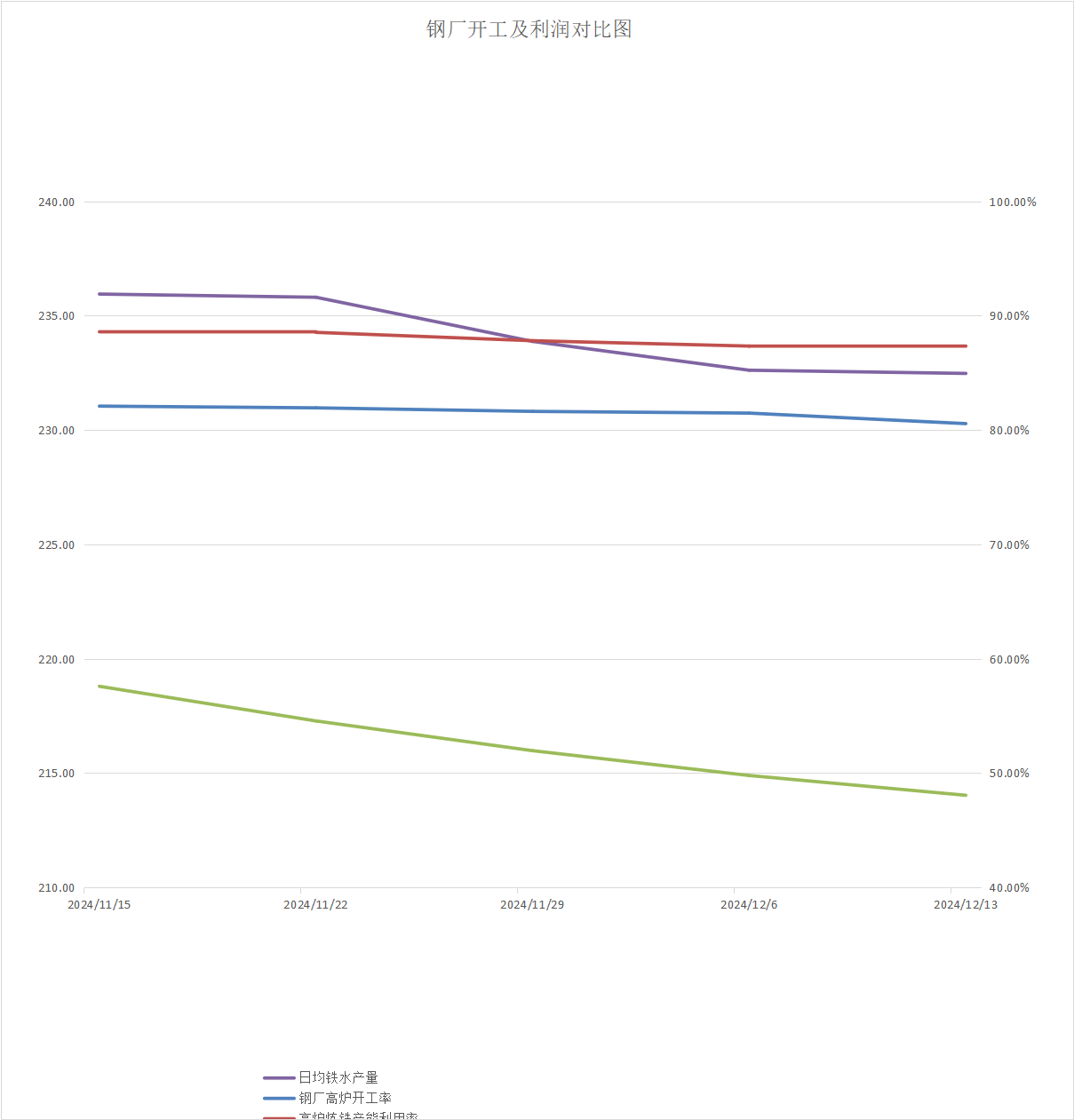 需求方面,截至12月13日,钢厂高炉开工率80.55%,周环比下降0.92%;高炉炼铁产能利用率87.28%,环比下降0.05%;钢厂盈利率48.05%,环比下降1.73%;日均铁水产量232.47万吨,环比减少0.14万吨;当前样本钢厂的进口矿日耗为289.22万吨,环比增加0.37万吨。本周钢厂开工情况、铁水产量保持趋稳。本周下游钢材行情一般,但钢厂生产利润继续下降,所以钢厂有意控制生产规模,高炉检修操作增加,因此铁水产量缩减。近期钢厂利润水平连续下行,据本周钢厂停复产计划来看,下周检修量有所增加,但本周集中检修,预计下周铁矿需求释放有所缩减。