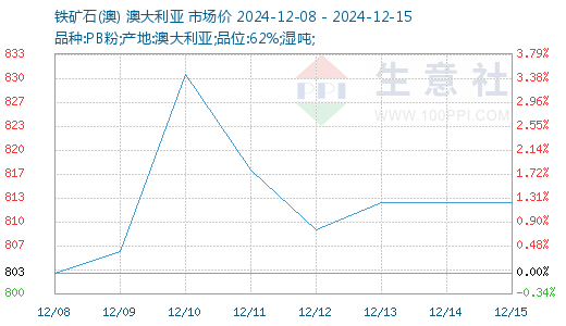 据生意社商品行情分析系统显示,本周(12.8-12.15,下同)铁矿价格窄幅震荡运行。截至15日,生意社铁矿价格指数为813.22,环比上行1.23%,具体如上图。本周铁矿行情呈现先涨后跌,窄幅震荡趋势,其主要原因在于市场消息频出,刺激市场交易情绪,使得市场对冬储存有预期,交易需求释放;钢厂由于利润继续下行,谨慎观望居多,铁矿采购操作以按需补库为主;铁矿供需双弱,所以本周铁矿价格先涨后跌,窄幅震荡运行。