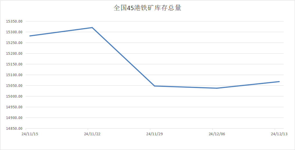 库存方面,截至12月13日,全国45个港口进口铁矿库存为15067.37万吨,环比增加30.78万吨;日均疏港量为337.13万吨,周环比增加13.76万吨;在港船舶数102条,与本周相比减少7条。本周铁矿港口库存情况如上图;全国钢厂进口铁矿库存总量为9431.9万吨,周环比增加59.75吨。本周港口疏港量开回增,港口库存量趋稳。钢厂利润继续下降后续预计会控制生产规模,海外发运增长,港口库存仍有累库库可能,下周仍需要多关注港口铁矿库存变化。