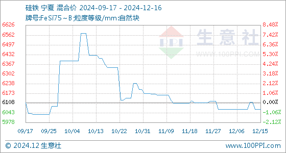 12月16日,生意社硅铁基准价为6064.29元/吨,与本月初(6067.14元/吨)相比,下降了-0.05%。