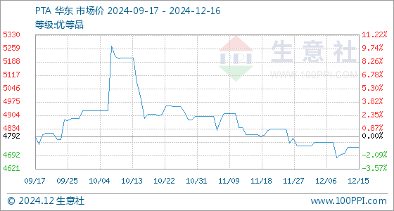 12月16日,生意社PTA基准价为4734.00元/吨,与本月初(4741.00元/吨)相比,下降了-0.15%。
