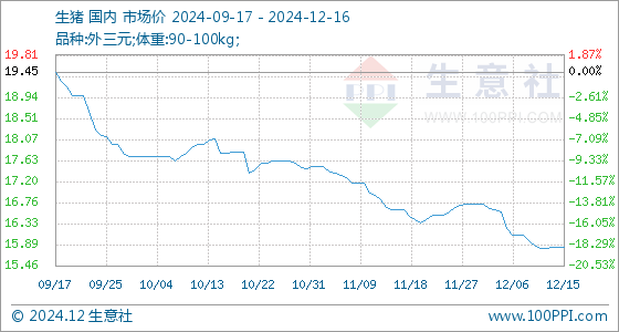 12月16日,生意社生猪基准价为15.83元/公斤,与本月初(16.72元/公斤)相比,下降了-5.32%。
