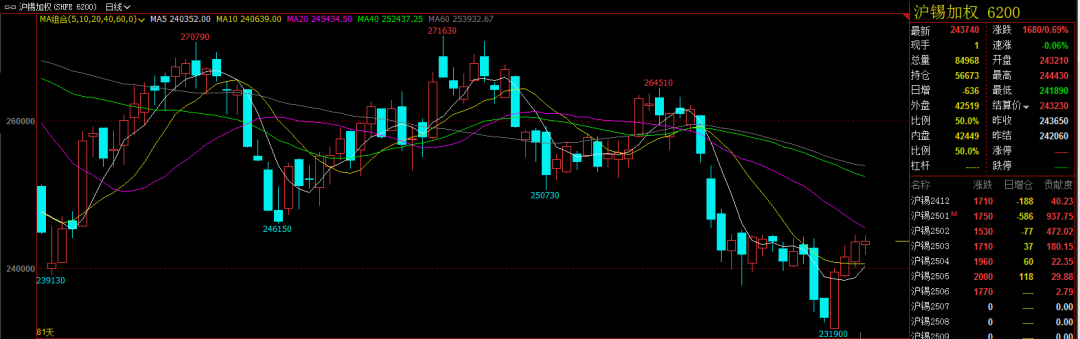 今日沪锡期货继续震荡,主力2501月合约期货价格最终报收在244450元/吨,上涨530元/吨或0.22%。