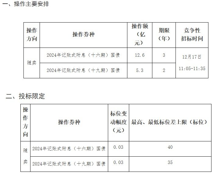 操作方向为随卖,操作券种为2024年记账式附息(十六期)国债、2024年记账式附息(十九期)国债,操作额分别为12.6亿元、5.3亿元,期限均为3年,12月17日为竞争性招标时间。12月20日起与同期国债合并上市交易。