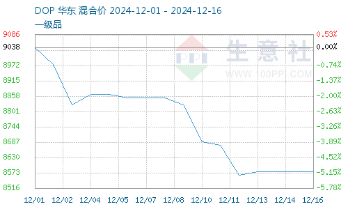 据生意社商品行情分析系统,截止12月16日,DOP价格8576.25元/吨,较12月9日DOP价格8826.25元/吨震荡下跌,跌幅2.83%。异辛醇价格震荡下跌,增塑剂成本下降,增塑剂企业开工积极性提升,增塑剂开工率高位,增塑剂供给充足。下游PVC淡季来临,增塑剂需求回落,增塑剂DOP库存过剩风险加剧,增塑剂DOP价格震荡下跌。