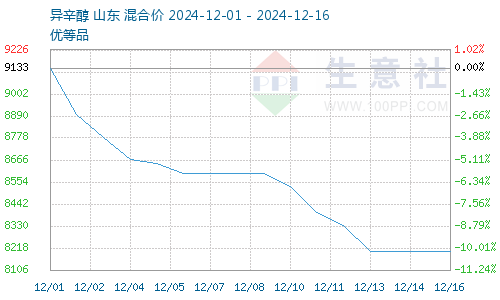 据生意社商品行情分析系统,截止12月16日,异辛醇报价8200元/吨,较12月9日异辛醇价格8600元/吨震荡下跌,跌幅4.65%。异辛醇企业开工高位稳定,加之12月辛醇新产能陆续投产,12月异辛醇供给增长明显。下游需求增量不及辛醇增量明显,异辛醇供给过剩,异辛醇下跌压力加大,异辛醇价格震荡下跌。