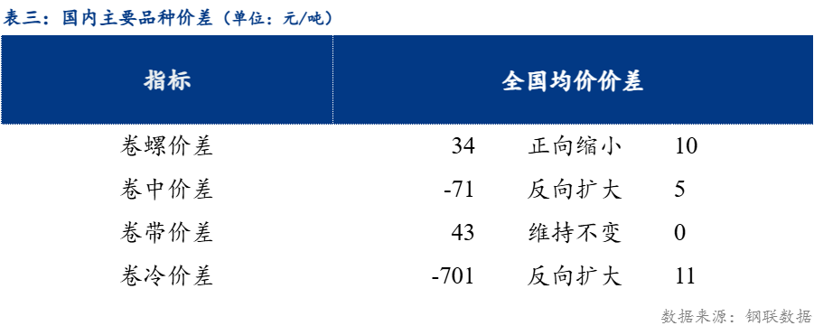 从品种价差来看,卷螺差较上一交易日正向缩小10元/吨,热中价差较上一交易日反向扩大5元/吨,热带价差较上一交易日维持不变,热冷价差较上一交易日反向扩大11元/吨 。