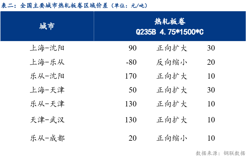 从区域价差来看,华东与东北价差90元/吨,较上一交易日正向扩大30;华东与华南价差-80元/吨,较上一交易日反向缩小20元/吨;华南与华北价差为130元/吨,较上一交易日正向扩大10 。