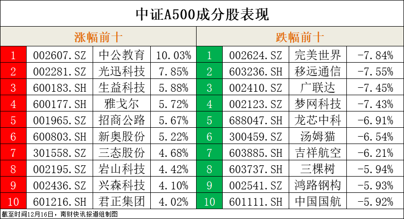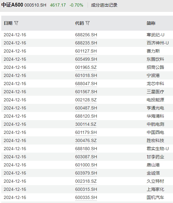 12月16日,市场全天震荡走低,创业板指领跌,高位股开始出现退潮。中证A500指数(000510.CSI)收跌0.70%,报4617.17点。