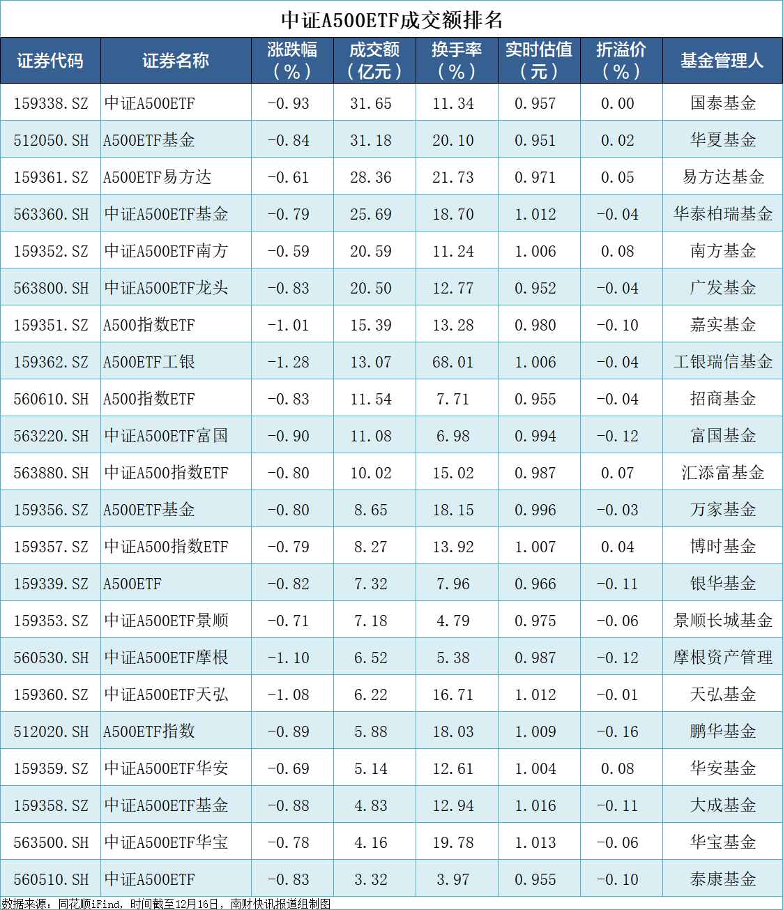 22只跟踪中证A500指数的ETF集体收跌,成交金额为286.56亿元,较上一个交易日减少56亿元。