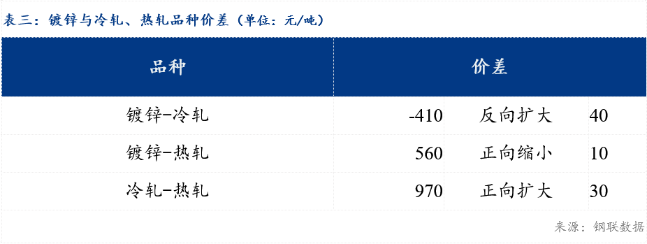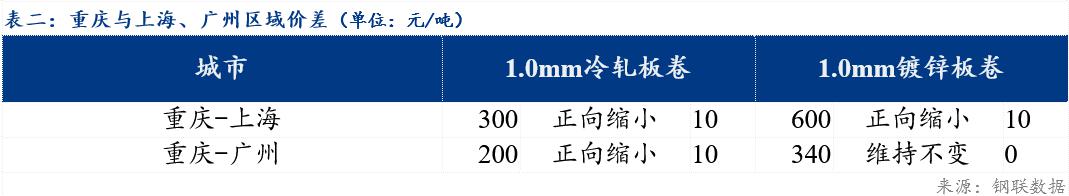 重庆、上海地区冷轧板卷区域价差缩小10元/吨;重庆、广州冷轧板卷区域价差缩小10元/吨。重庆、上海镀锌板卷区域价差缩小10元/吨;重庆、广州镀锌板卷区域价差维持不变。镀锌、冷轧品种价差反向扩大40元/吨 ;镀锌、热轧品种价差缩小10元/吨 ;冷轧、热轧品种价差扩大30元/吨 。