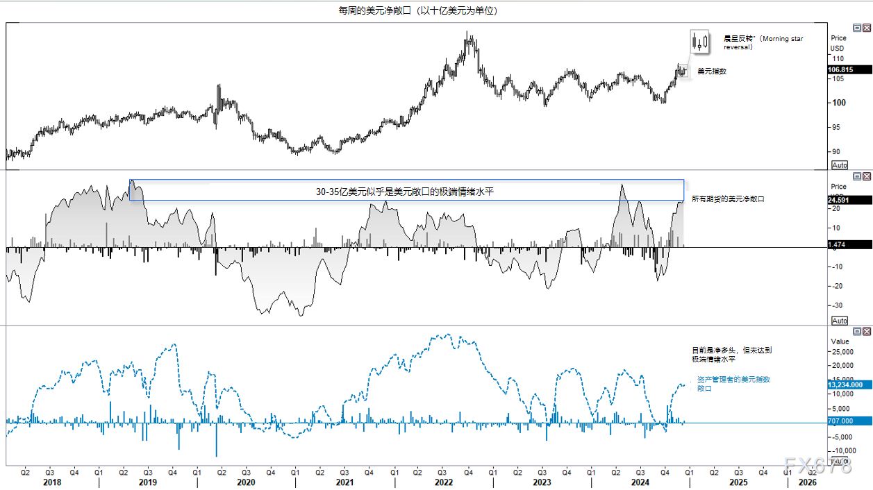 美元指数上周形成了一个为期三周的看涨反转模式,被称为晨星反转。市场似乎希望将美元推高至三周前创下的14个月高点之上。根据国际货币市场(IMM)的数据,上周交易者做多美元246亿美元,达到七个月来的最高水平。资产管理公司小幅增加了对美元指数的净多头敞口,增加了707份合约——所有这些合约都是新的多头头寸,空头头寸没有变化。值得注意的是,资产管理公司的净多头敞口并未达到极端情绪。