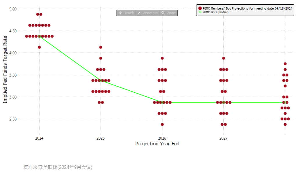 2025年展望:此前的点阵图显示2025年可能降息4次(100个基点),但因通胀风险仍高,这一预期可能下调至3次甚至2次降息。市场普遍预计2025年的利率将从3.375%上调至3.625%,也即是明年降息3次的基准情景。如果2025年的利率上调至3.875%,则表示明年仅降息2次,这将对市场构成显著的鹰派意外。