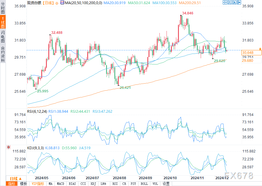 银价目前在30.98-31.29美元的重要阻力位下方交易,若上破该区间可能引发进一步上涨。上行目标包括50日移动均线31.65美元。下行方面,交易商正关注关键支撑位,包括11月28日低点29.64美元和200日移动均线水平29.54美元,后者仍是维持银价看涨势头的关键阻力位。