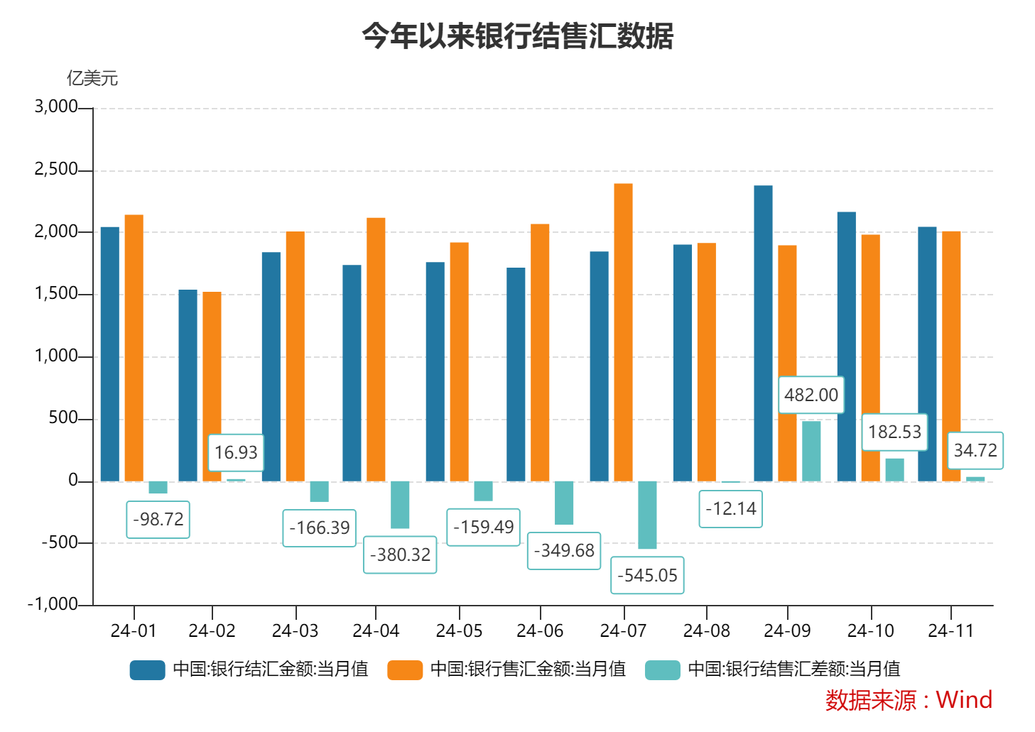 按美元计值,2024年11月,银行结汇2044亿美元,售汇2009亿美元。2024年1~11月,银行累计结汇20970亿美元,累计售汇21966亿美元。