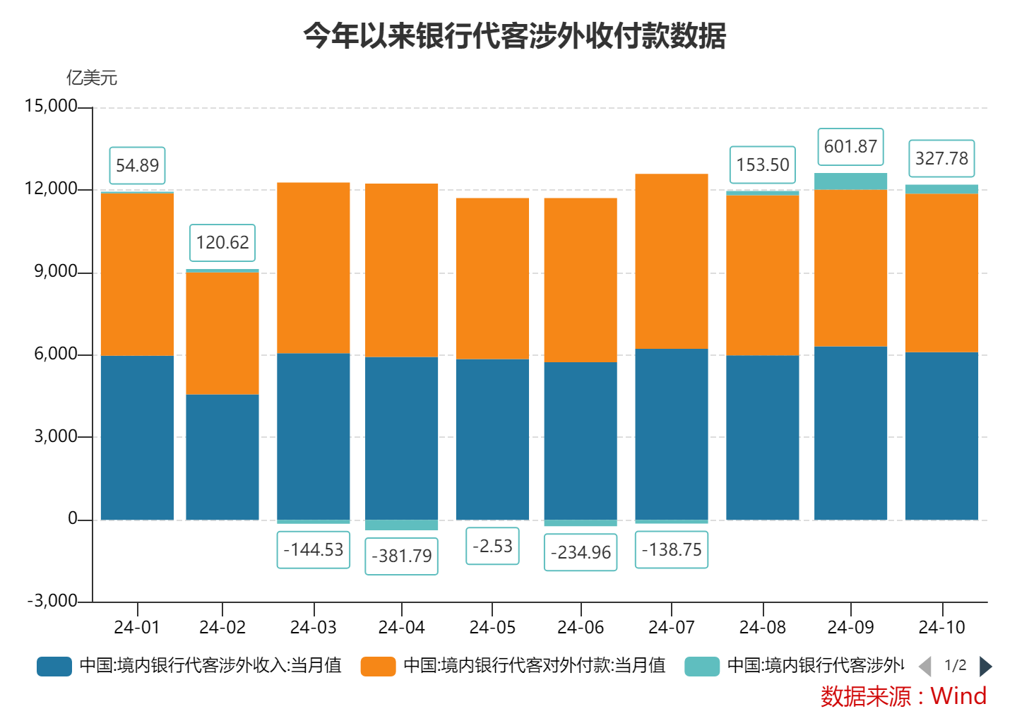 2024年11月,银行代客涉外收入42547亿元人民币,对外付款43945亿元人民币。2024年1~11月,银行代客累计涉外收入459715亿元人民币,累计对外付款458598亿元人民币。