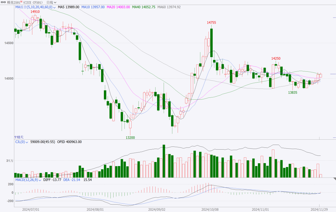 期货方面:11月以来,郑棉CF2501合约盘面价格持续在14000元/吨关口上下盘整、反复争夺,波动幅度不足200点,走出典型的“磨底”行情。