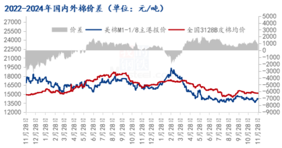 郑棉CF2501合约则持续在14000元/吨关口上下盘整,随着近期ICE棉价反弹,1%关税下(或滑准关税)外棉进口成本与内地库新疆棉报价顺挂幅度逐步收窄,港口保税棉、即期棉及船货竞争力较11月上中旬下降。具体来看,11月27-28日中国各主港保税巴西棉SM1-5/32(强力28/29/30GPT)净重报价78.65-81.65美分/磅(含2022/23年度、2023/24年度棉花),1%关税下的直接进口成本为13790-14310元/吨(滑准关税下进口成本14475-14825元/吨),与内地棉现货相比,1%关税下内外棉价顺挂1500-2000元/吨。