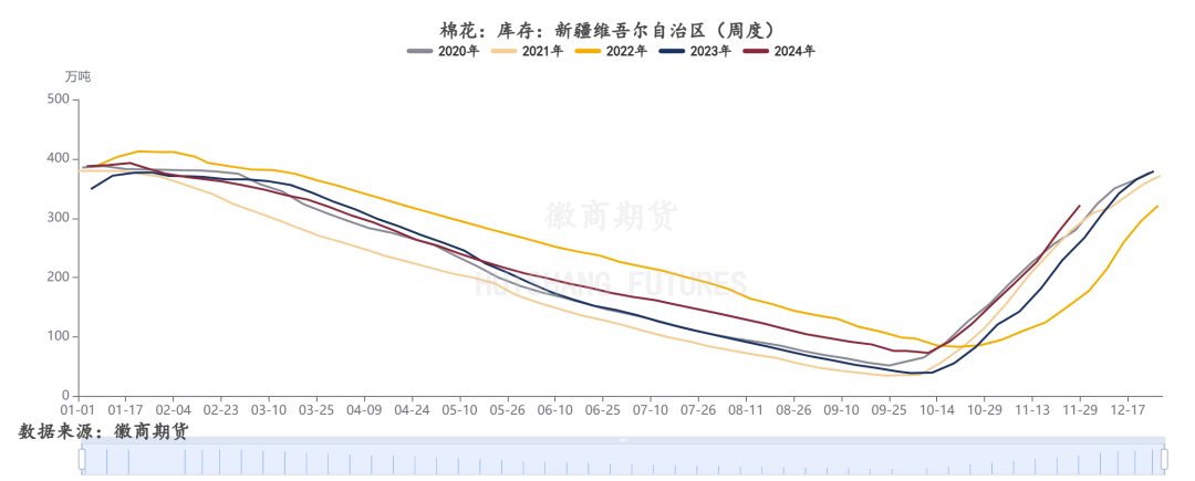 随着疆内棉花收购进度、加工/公检进度快速推进。据统计,截至2024年11月28日,新疆皮棉加工量已突破417万吨,新疆监管类公证检验也达到351.84万吨。棉花商品库存、社会供应量大幅增加。