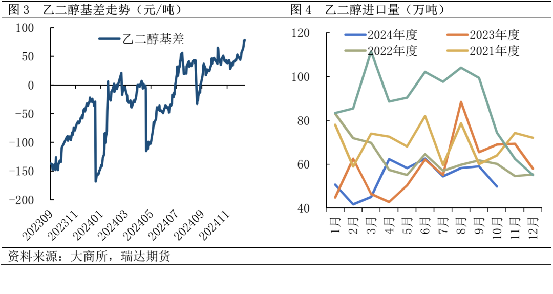 今年以来,乙二醇库存水平不断下移,主港库存总量在45万吨水平,接近2020年年初历史低位,主要由于进口量偏低导致,2024年1-10月,我国进口乙二醇总量542.47万吨,同比下降7.65%。根据到港预报,本周到货预期16.39万吨,环比上期有所回升。海外装置方面,台湾南亚1号36万吨装置12月上旬重启,沙特JUPC64万吨装置计划12月底重启,预计海外产量逐步提升,综合来看,11-12月进口量在55-60万吨。
