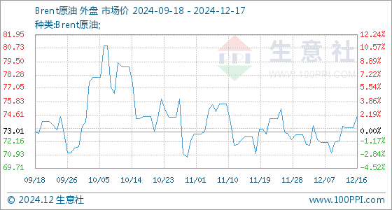 12月17日生意社Brent原油基准价为74.49美元/桶