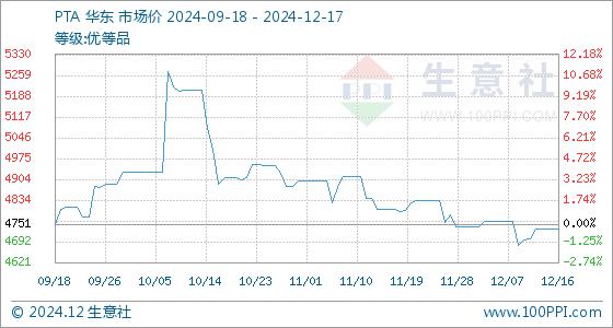 12月17日,生意社PTA基准价为4734.00元/吨,与本月初(4741.00元/吨)相比,下降了-0.15%。