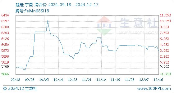 12月17日,生意社锰硅基准价为5970.00元/吨,与本月初(6040.00元/吨)相比,下降了-1.16%。