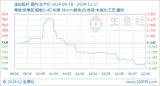 12月17日,生意社涤纶短纤基准价为7135.00元/吨,与本月初(7176.67元/吨)相比,下降了-0.58%。