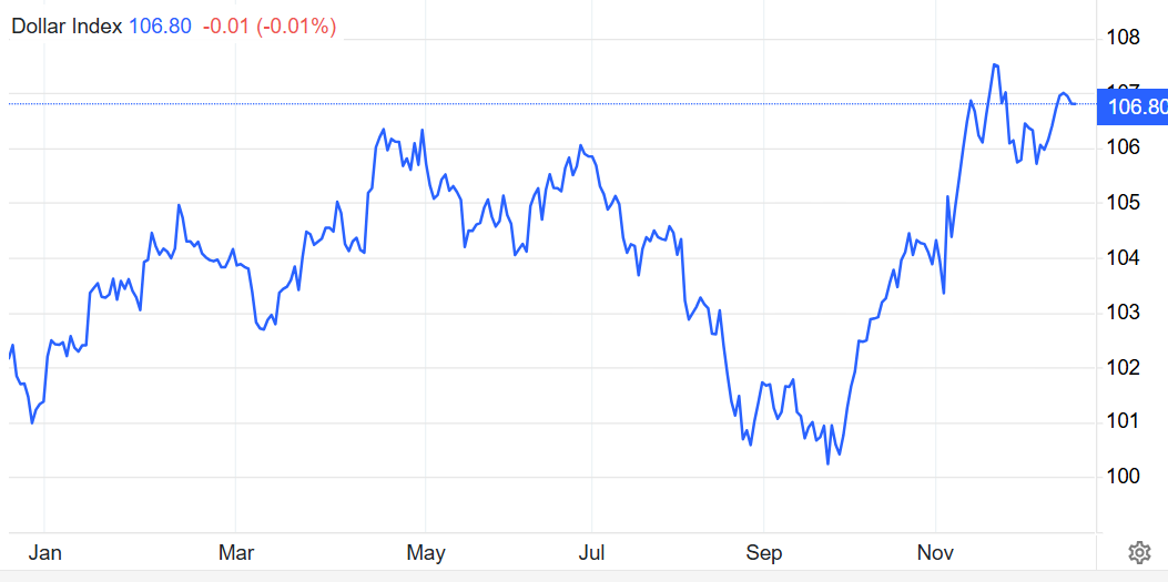 在美联储宣布万众期待的2024年第三次降息前夕美元意外保持坚挺态势,衡量美元兑一篮子货币强弱的美元指数在周二亚盘期间持稳于106.8点位上方,接近近期所创下的阶段性高点,主要因交易员们近期持续定价明年特朗普上台之后,他主导的对内减税与对外加征关税将使得美联储2025年降息步伐将大幅放缓甚至将有一段时间将停止降息,因此上调中性利率预期,并且交易员们押注美联储主席鲍威尔将在宣布降息后的新闻发布会上展现“鹰派的预期管理措辞”,这些也是美元兑多国汇率近期大幅上行的逻辑。