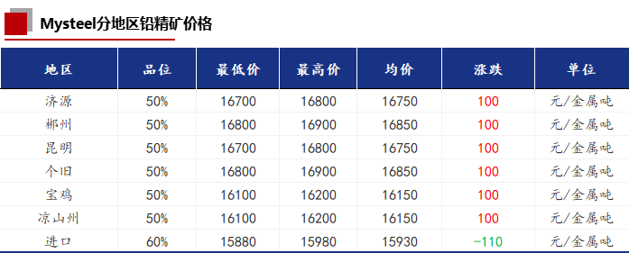 今日受铅锭价格影响,铅精矿价格受铅锭价格影响较上一交易日涨100元/金属吨。铅精矿加工费各地区均未调整,较上一交易日持平。进口铅精矿价格较上一交易日跌110元/金属吨。