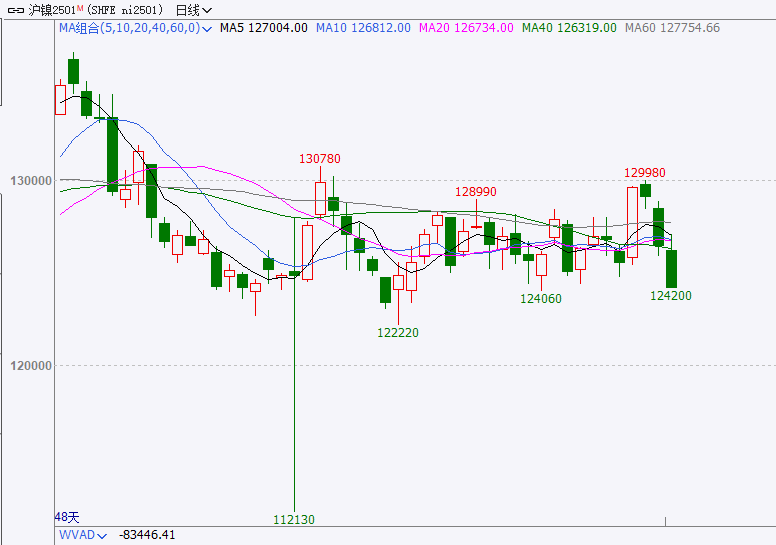 12月17日沪镍主力2501合约盘中逐渐下探,截止下午收盘报124200,跌幅2.06%,录得三连阴。