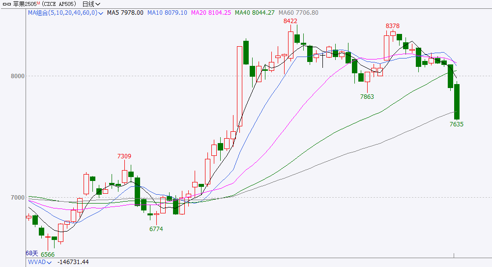 受需求不足影响,苹果冷库去库偏慢,今日国内苹果期货主力2505合约大幅下跌,截至收盘报7643元/吨,跌幅达到3.79%,跌301元/吨。