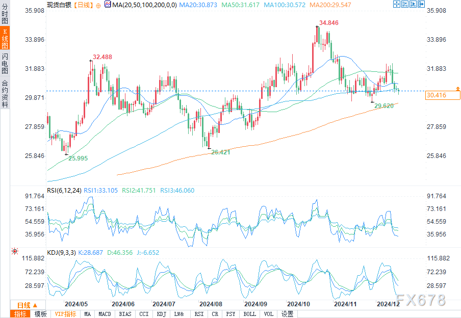 汇通财经APP讯——周二(12月17日)美盘时段,现货白银价格下跌,跌至每盎司30.41美元,因美元走强和美国国债收益率上升继续打击投资者信心。在美联储做出政策决定之前,市场仍持谨慎态度,交易员密切关注未来利率调整的暗示。